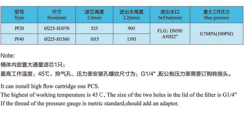 PF型大通量過濾器具有通量大、使用壽命長(zhǎng),及對(duì)復(fù)雜水質(zhì)的操作性等優(yōu)點(diǎn),可廣泛應(yīng)用于污水與廢水回用、海水淡化、電子等領(lǐng)域。整個(gè)過濾單元由兩部分部分:過濾器外殼及濾芯。