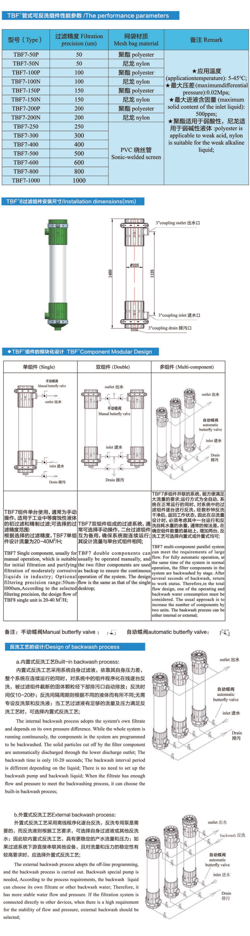 - TBFBTubular Backwash Filter Components adopt all plastic materials, especially suit for moderately corrosive liquid solid-liquid separation process. Filter element with different precision., due to its repeated-use characteristics of detachable and backwashing, it can play a unique role in the limited application field of the conventional filter and bag filter, and has lower running costs. Multi- component parallel integration system can be flexible to meet the requirements of the different mass flow; PLC program control can realize one by one component online or ofline, while other online components work continuously without the whole set of backup, which greatly save the investment cost;